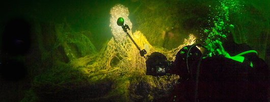| Foto: Wolf Wichmann Schleppnetze aus Kunststoffmaterial haben sich ein einem Wrack verfangen und umhüllen es geisterhaft, Todesfalle für Fische und Quelle für Plastikmüll im Meer |