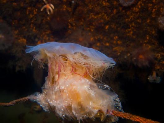 ![]() Foto: Wolf Wichmann Feuerqualle, die sich mit ihren Fangarmen an einem Seil verfangen hat |