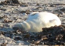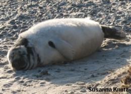 Die mitten im Winter neu geborenen Kegelrobben tragen ein creme-weißes Lanugo-Fell. An Schnauze und Flippern zeigt sich nach und nach der dunklere, gefleckte Erwachsenen-Pelz bis die Jungrobbe wie eine kleinere Ausgabe der Alten aussieht. Erst dann beginnt sie ihren nassen Lebensraum zu erkunden. |